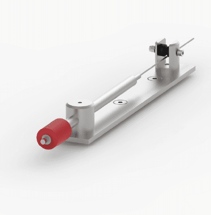 La plaque de montage maintient le transducteur à une extrémité et une poulie à l'autre. Un fil en acier inoxydable relie le transducteur à l'ancre opposée. La poulie permet de monter le transducteur et l'ancre sur différents plans, y compris sur des surfaces perpendiculaires, jusqu'à 10 m de distance. Le transducteur à ressort maintient le fil d'acier sous tension.