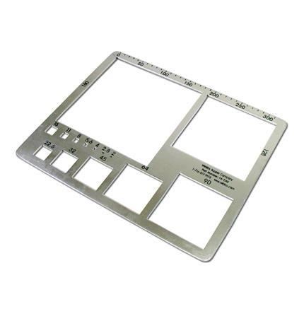 Cet appareil portatif - également connu sous le nom de gabarit de gravier et de compteur de cailloux - est utilisé pour classer ou mesurer le gravier et les sédiments de lit de la taille d'un petit caillou sur le terrain. Fabriqué en aluminium de 1/8", il comporte 14 trous carrés de tailles de tamis courantes (classes d'unités 1/2-phi) allant de 2 mm à 180 mm. L'échelle (par incréments de 10 mm) sur un côté peut être utilisée pour mesurer jusqu'à 310 mm. 13,5 x 11" (342,9 mm x 279,4 mm). Poids 0,62 lbs. (1,4 kg).