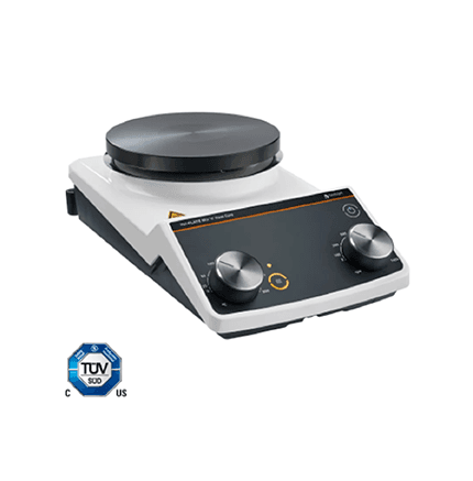 Cet agitateur magnétique est très facile à utiliser et est équipé des principaux dispositifs de sécurité. La grande distance de sécurité entre la plaque chauffante et les éléments de commande, ainsi que l'indicateur optique de chaleur résiduelle à des températures > 50 °C, protègent contre les brûlures. Une aide au transport située sur le dessous de l'appareil permet de le transporter en toute sécurité.
