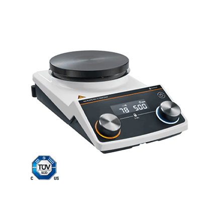 Cet agitateur magnétique est équipé des principaux dispositifs de sécurité. La grande distance de sécurité entre la plaque chauffante et le panneau de commande, ainsi que l'indicateur visuel de chaleur résiduelle à des températures > 50 °C, protègent contre les brûlures. Une aide au transport située sur le dessous de l'appareil permet de le transporter en toute sécurité.