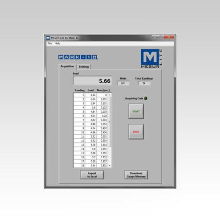 MESUR™ Lite est un programme de collecte de données de base fourni avec toutes les nouvelles jauges Mark-10 dotées de sorties. MESUR™ Lite permet de tabuler les données continues ou ponctuelles d'une jauge. Les données enregistrées dans la mémoire de la jauge peuvent également être téléchargées en masse.