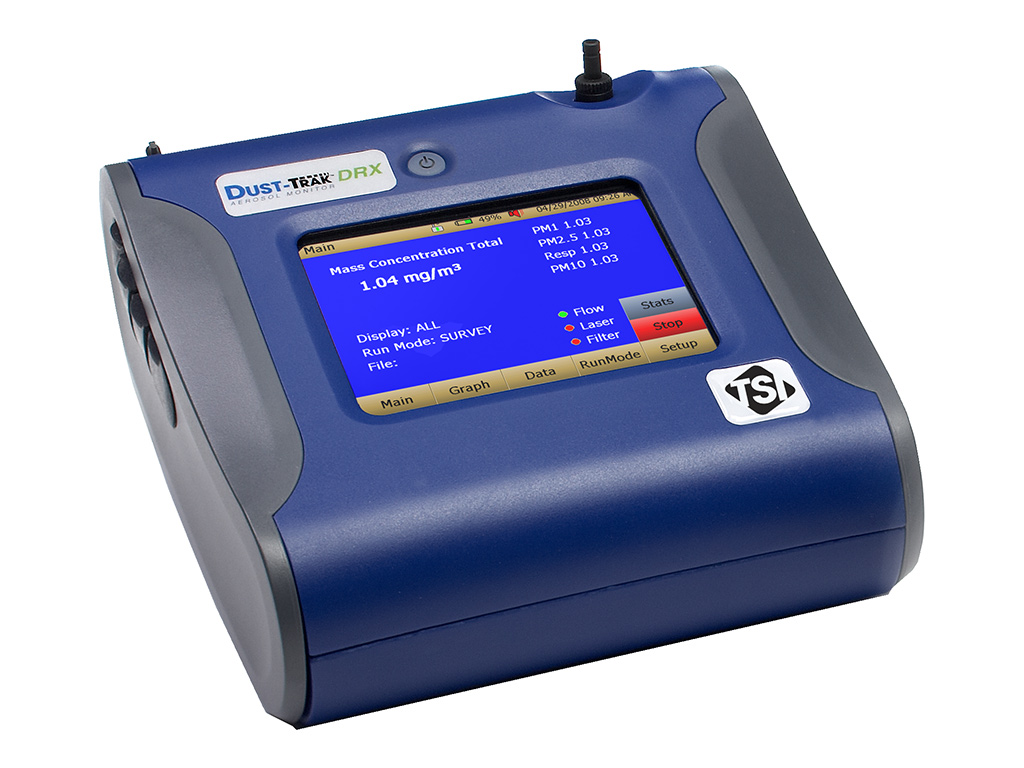 Leader dans l'industrie de la surveillance des poussières en temps réel, le moniteur d'aérosols DustTrak™ DRX 8533 peut mesurer simultanément la masse et la fraction granulométrique.