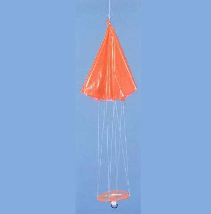 Le parachute se compose de trois éléments principaux : une voilure en film polyéthylène de couleur orange/rouge, des suspentes en coton et un cerceau d’écartement en plastique de couleur orange. L’arceau d’écartement est équipé d’une suspension élastique avec un anneau en D pour un usage général. Tous les détails ici