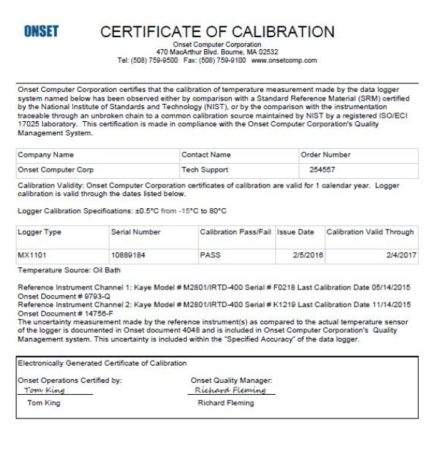 La certification est disponible pour tous les enregistreurs de données et capteurs Onset actuellement fabriqués.