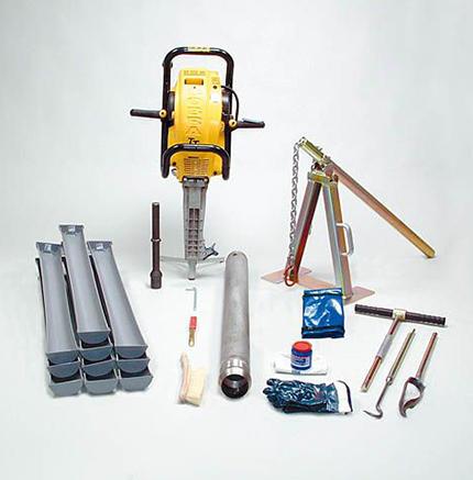 La tarière cylindrique de la colonne de sol est enfoncée dans le sol à l'aide d'un marteau mécanique à essence (sur demande spéciale, un marteau électrique).