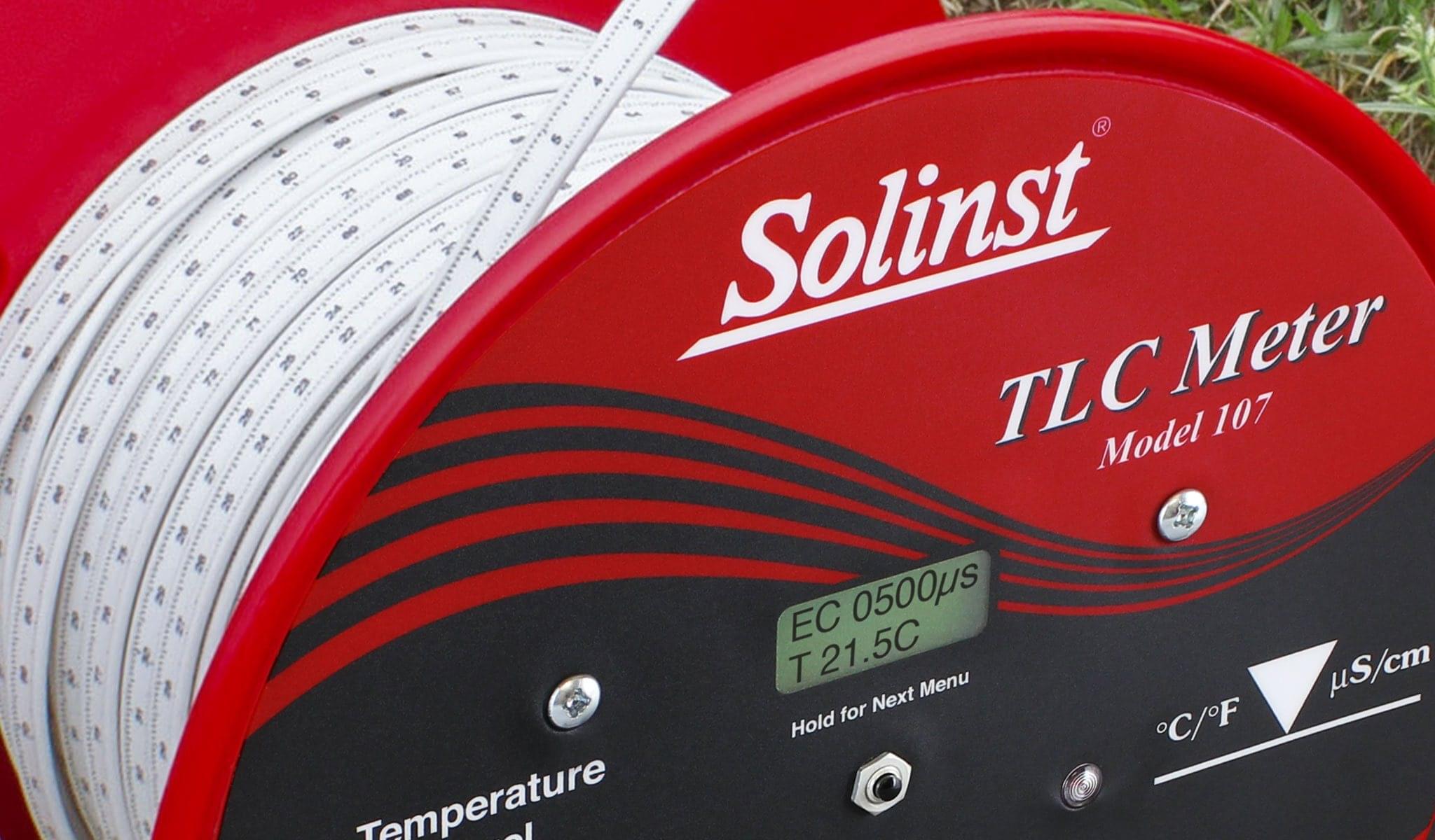 The Model 107 TLC Meter is ideal for profiling conductivity and temperature in wells and open water, for salt-water intrusion studies, and a general indication of contamination levels. The 3/4″ (19 mm) diameter probe is attached to Solinst PVDF flat tape; accurately laser marked every 1/100 ft or each millimeter. Lengths up to 1000 ft or 300 m, mounted on a Solinst reel.