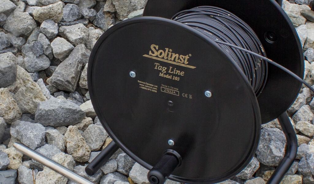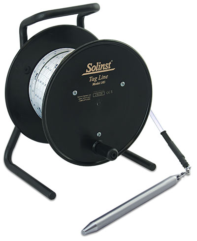 The Solinst 103 Tag Line is a simple tool primarily used to measure total well depth and the depths of backfill sand and bentonite layers during the construction of a well. The Tag Line uses a stainless steel weight connected to accurately marked cable or flat tape. The weight is clipped off, allowing the reel mounted cable or tape to be used for lowering bailers, pumps, or other devices to specific depths in a well. Standard lengths to 300 m (1000 ft).