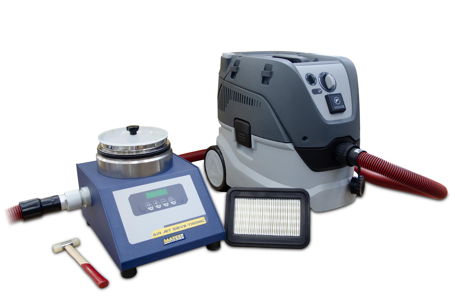 Compatible with 200 mm diameter test sieves (A058 series), the unit includes a transparent plexiglass lid, vacuum aspirator, and an automatic cleaning system for the filter cartridge, ensuring uninterrupted testing for several sessions before maintenance is needed.