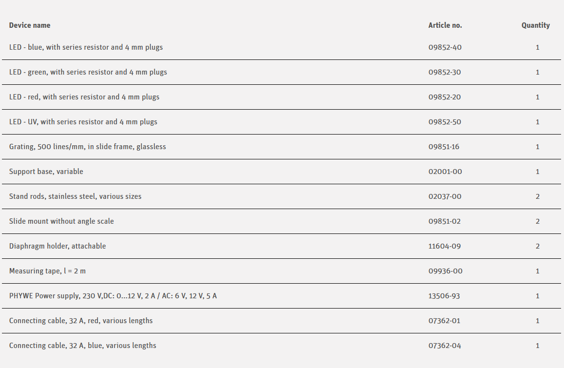 In this experiment, for various LEDs (light emitting diodes) the wavelength is determined by means of a grating using the subjective method.