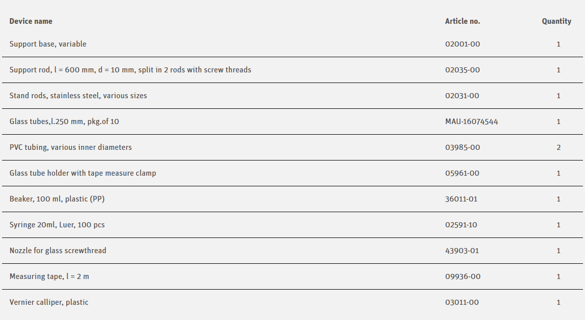 Using a U-tube made of a piece of tubing and glass tubes, the students should show that the product of pressure and volume of a confined quantity of gas is constant. Moreover, they should measure the difference in height between the water levels for pressure decrease and increase; the correlation should be illustrated with calculations and by investigating a diagram.