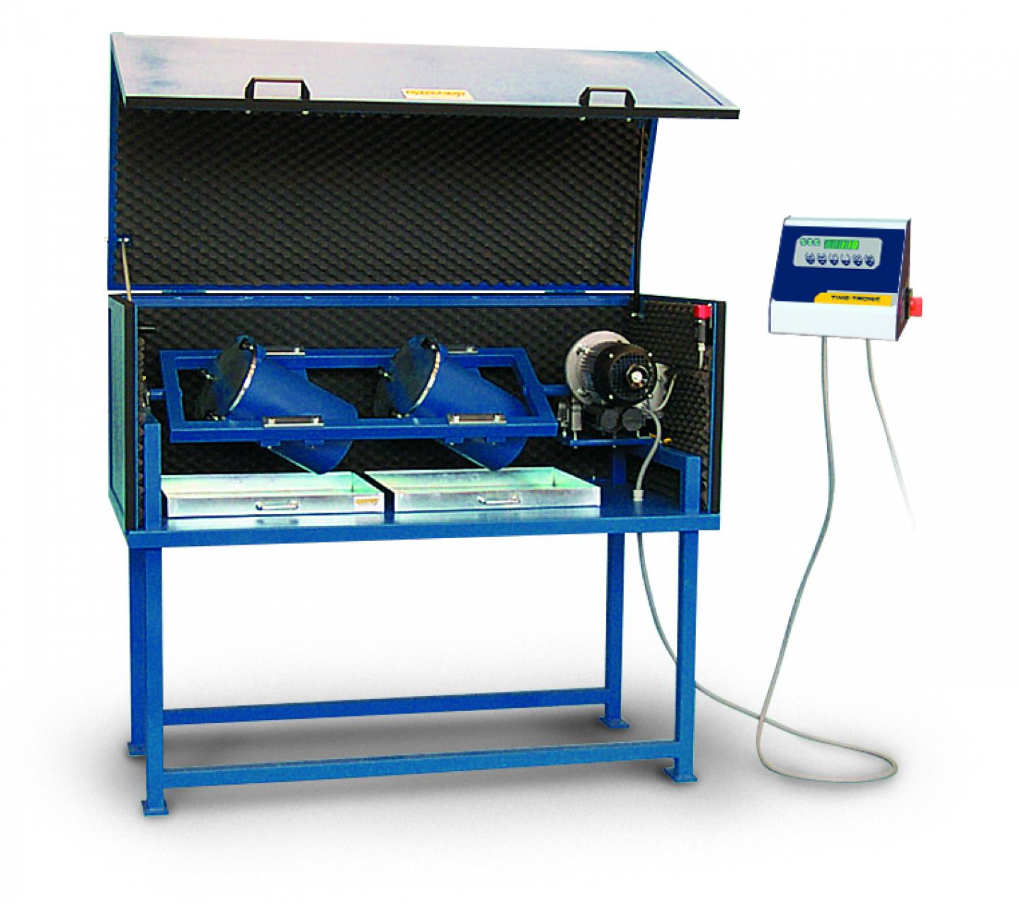 The cabinet is manufactured from sheet steel, internally lined with soundproofing material, and equipped with a microswitch system: when the door is opened during operation, the machine automatically stops to protect the user.