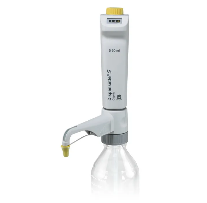 Dispensette® S Organic (yellow color-code): Ideal for dispensing organic solvents, including chlorinated and fluorinated hydrocarbons (e.g., trichlorofluoroethane and dichlormethane), acids like concentrated HCl and HNO3 (except HF), trifluoroacetic acid (TFA), tetrahydrofuran (THF) and peroxides.