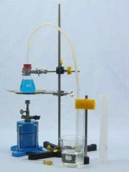 Coloured water is brought to a boil and the water vapour is conducted into a cooled test tube. The colour and quantity of water before and after distillation are observed.