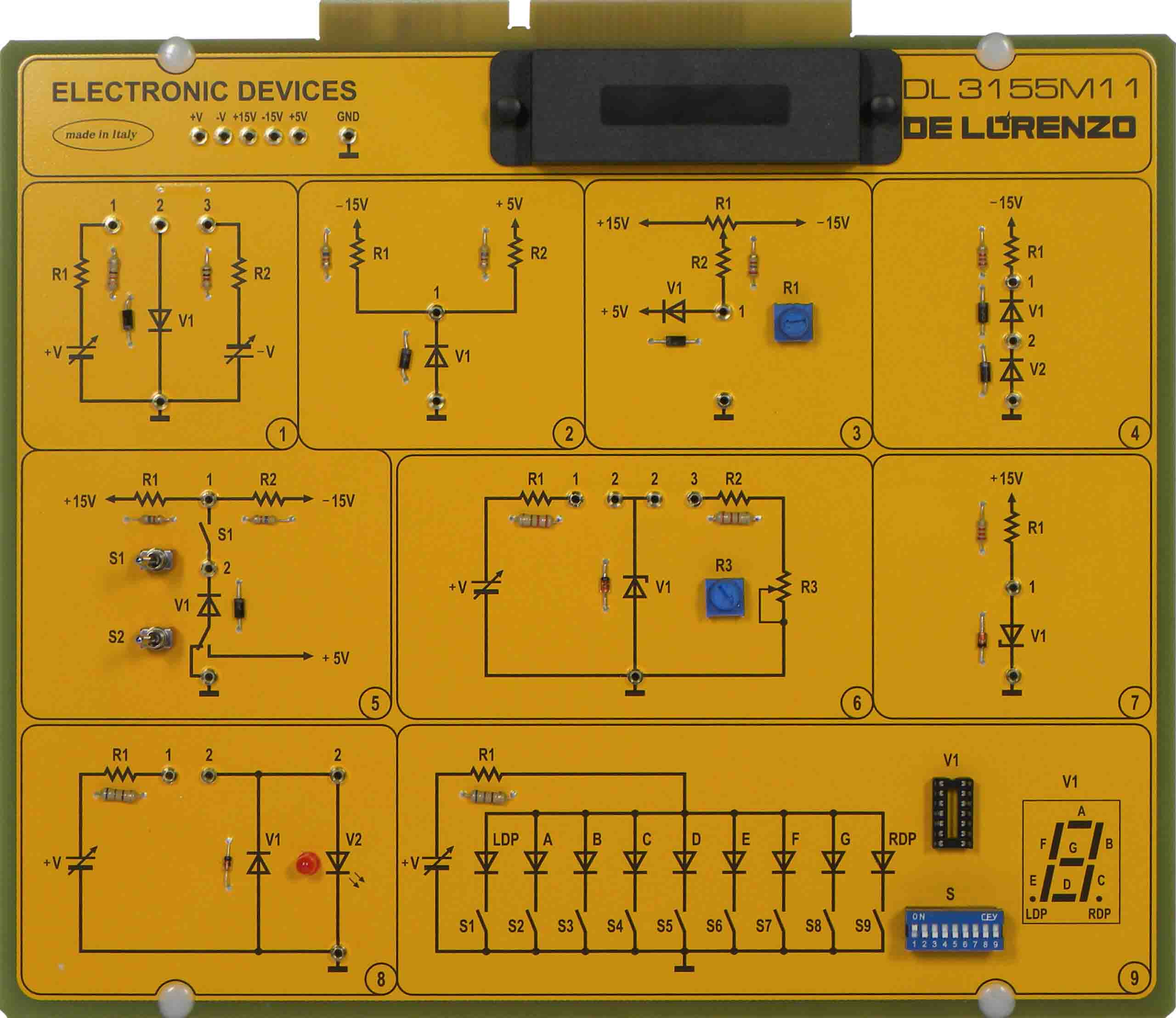 With this board the students can study the properties of the pure and doped semiconductor material, the properties and the electric behaviour of a junction P‐N and how a junction P‐N is realized to be able to describe with the right terminology the junction P‐I behaviour.