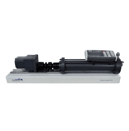 The enterprise level controller is aimed at commercial testing and is available in one configuration, 1MPa pressure and 200cc volume. Liquid (normally deaerated water) in a cylinder is pressurised and displaced by a piston moving into the cylinder. The piston is actuated by a ball screw turned in a captive ball nut by an electric motor and gearbox that move linearly on a ball slide. Click here to read our controller comparison.