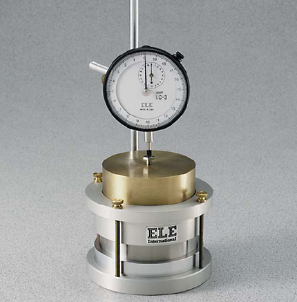 The unit consists of a cast aluminum base and collar, stainless steel specimen ring, porous stones, dial indicator, and a 12.6 lb. (5.7 kg) loading weight.
