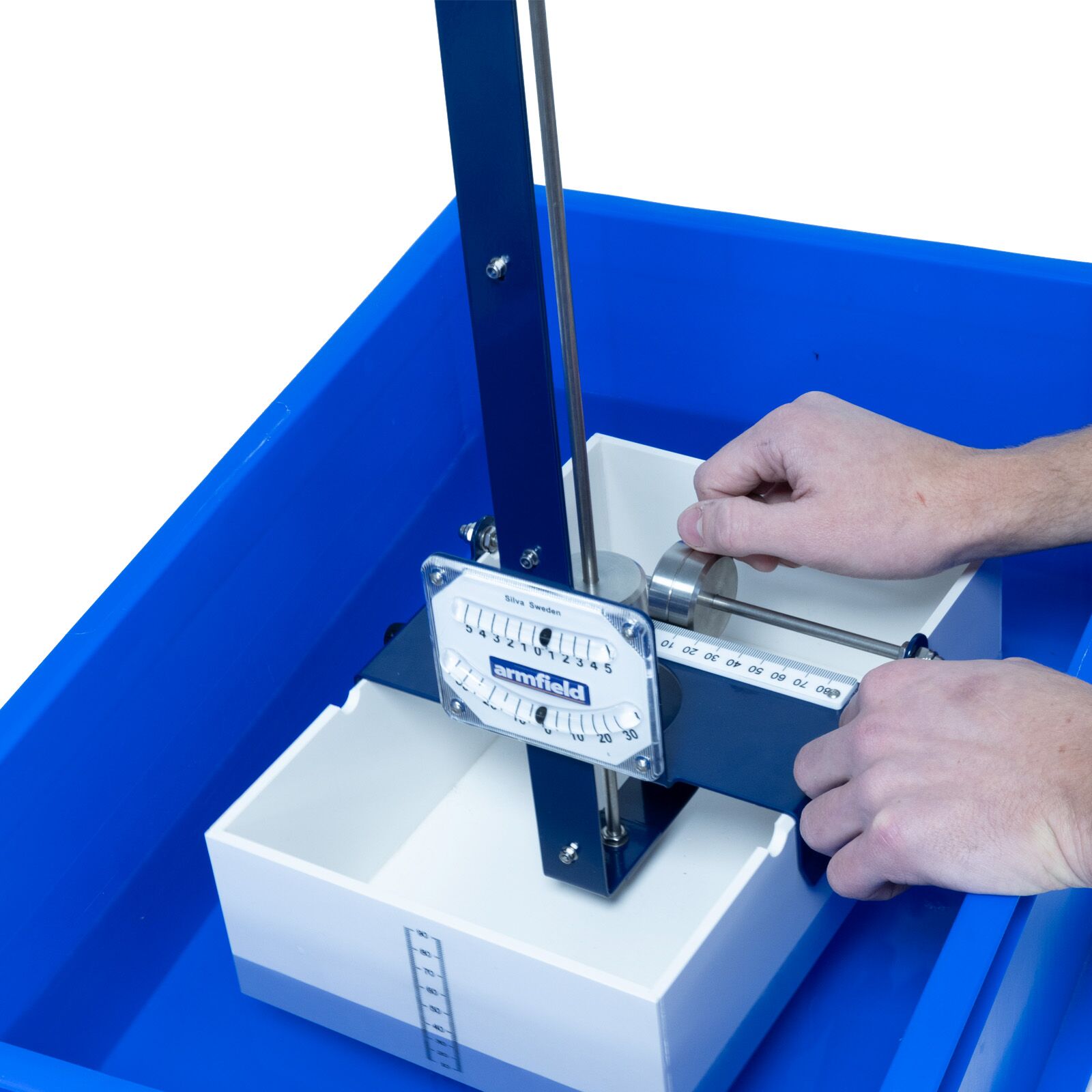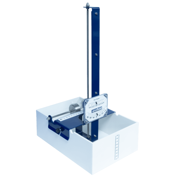 This equipment enables a thorough investigation of the factors affecting the stability of a floating body. The metacentre will produce stable and unstable equilibrium, a plumb-bob is suspended from a mast, indicating the angle of heel on a calibrated scale.