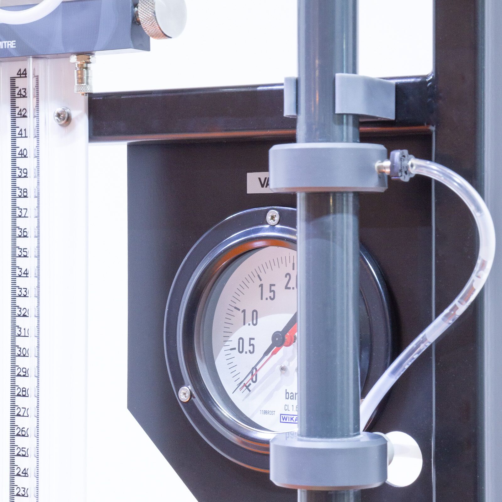 All are instrumented with upstream and downstream pressure tappings. These tappings are connected to a bank of 12 water manometer tubes mounted on the framework. Pressurisation of the manometers is facilitated by a hand pump.
