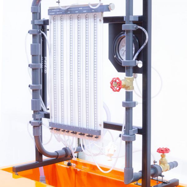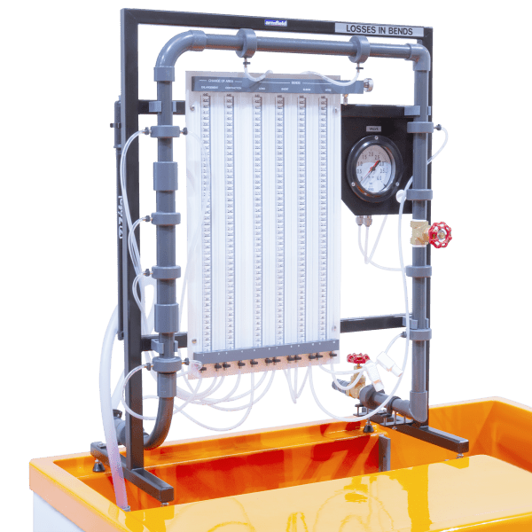 This accessory permits losses in different bends, a sudden contraction, sudden enlargement and a typical control valve, to be demonstrated.