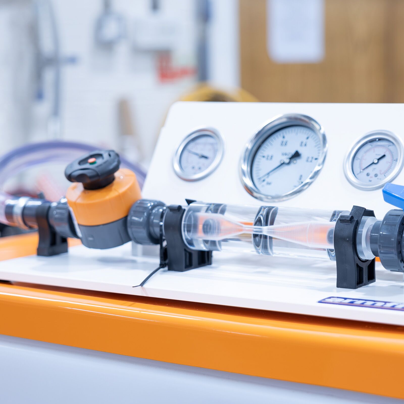 Bourdon gauges indicate the pressure upstream of the contraction, inside the throat and downstream of the expansion in the test section. Flow control valves upstream and downstream of the test section enable the flow and pressure to be adjusted, enabling cavitation to be clearly demonstrated.