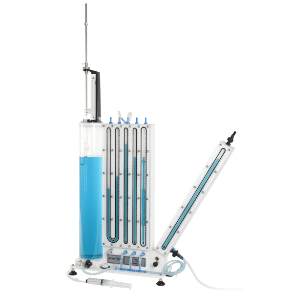 The Armfield F1-29 is designed to demonstrate the properties of Newtonian fluids and their behaviour under hydrostatic conditions (fluid at rest). This enables students to develop an understanding and knowledge of a wide range of fundamental principles and techniques, before studying fluids in motion. These include the use of fluids in manometers to measure pressure and pressure differences in gases and liquids. Some simple exercises are included to show how the behaviour of a fluid changes when flow is involved and the relevance of concepts such as frictional losses.