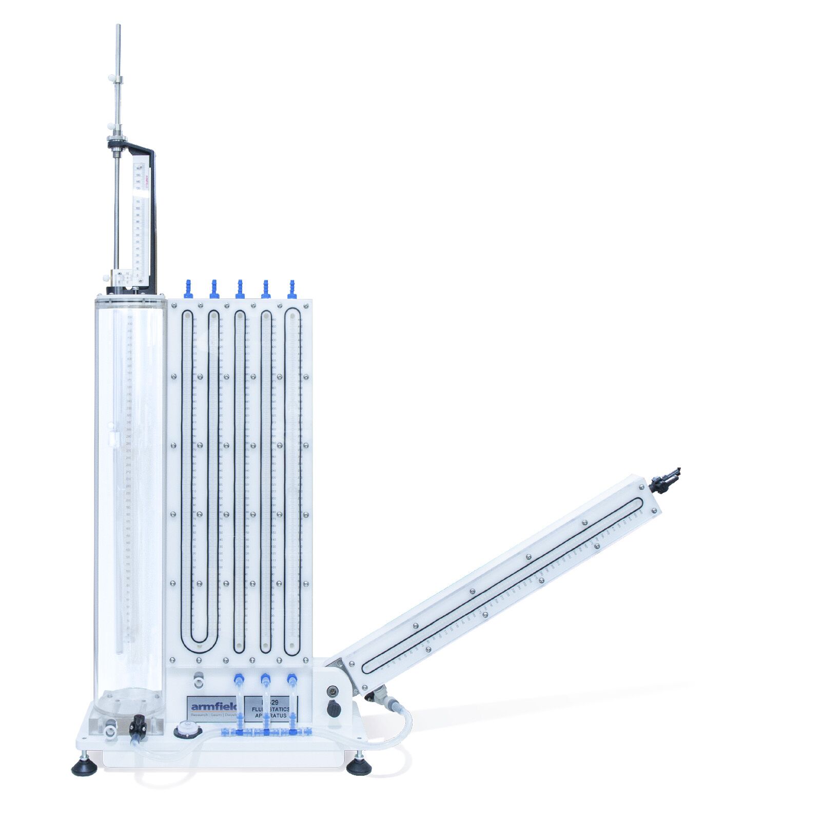The apparatus is constructed from PVC and clear acrylic, and consists of a vertical reservoir containing water that is connected to a series of vertical manometer tubes. These tubes can be used individually or in combination for the different demonstrations of hydrostatic principles and manometry. One tube includes changes in cross section to demonstrate that the level of a free surface is not affected by the size or the shape of the tube. The right-hand manometer tube is separate from the other tubes and incorporates a pivot and indexing mechanism at the base that enables this tube to be inclined at fixed angles of 5°, 30°, 60° and 90° (vertical).