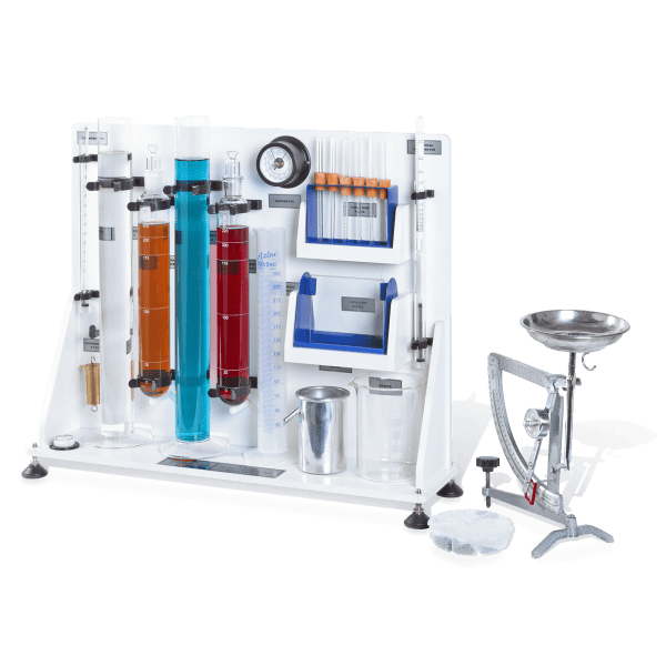 The apparatus consists of a collection of components that demonstrate individual fluid properties. The components are stored on a common support frame manufactured from PVC with circular spirit level and adjustable feet for levelling. The apparatus is designed to stand on a suitable benchtop where some of the components can be operated independently from the support frame.