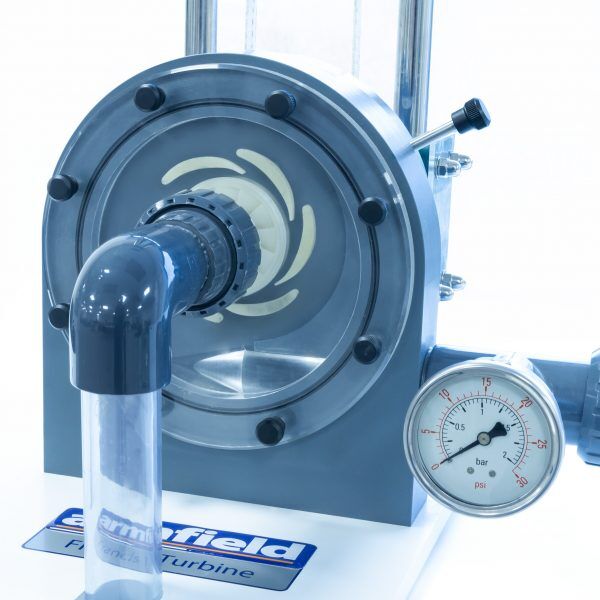 This demonstration turbine provides a simple low-cost introduction to the Francis inward flow reaction turbine showing its construction, operation and performance. The volute of the Francis Turbine incorporates a transparent front cover for clear visualisation of the runner and guide vanes and is designed to complement the F1-25 Pelton turbine.
