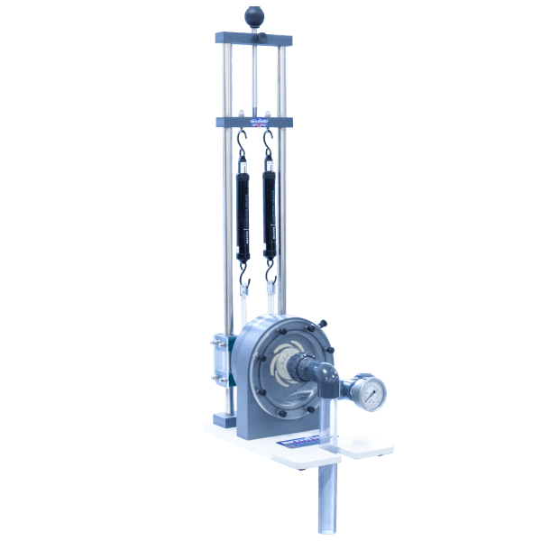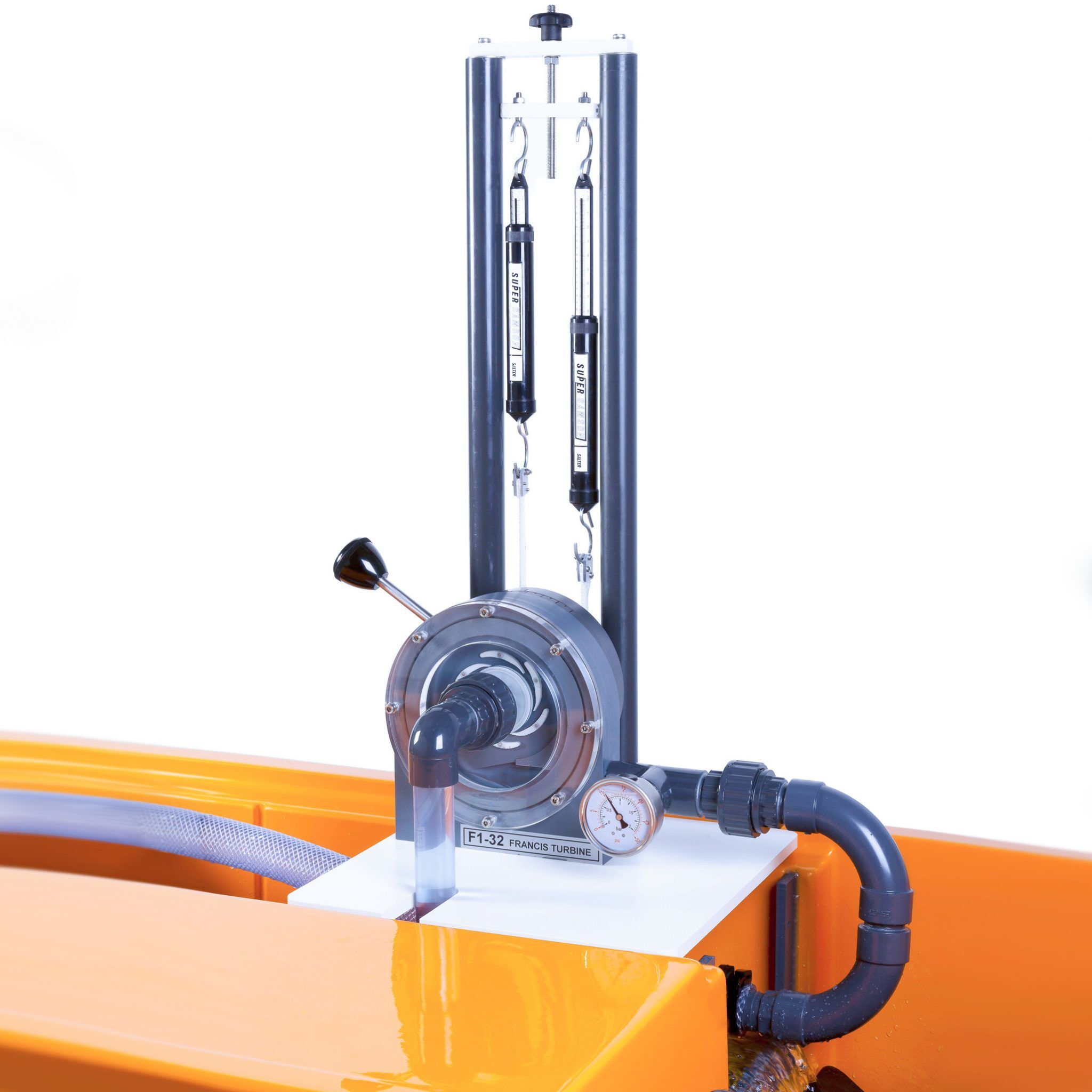 The head of water entering the turbine is indicated on a Bourdon gauge and the speed of rotation is measured using a non-contacting tachometer (not supplied).