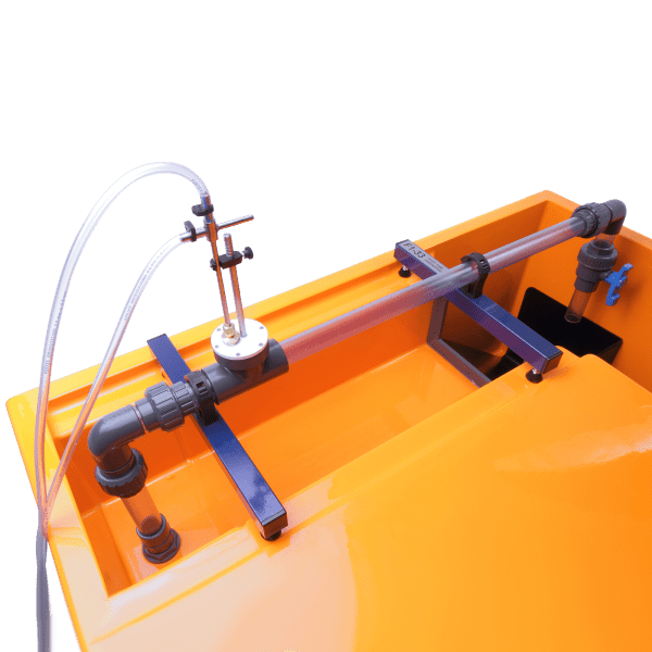 The pitot tube can be moved across the cross-section of the pipe in order to measure the dynamic head profile. The position of the measuring tip relative to the wall of the pipe can be read on a scale.