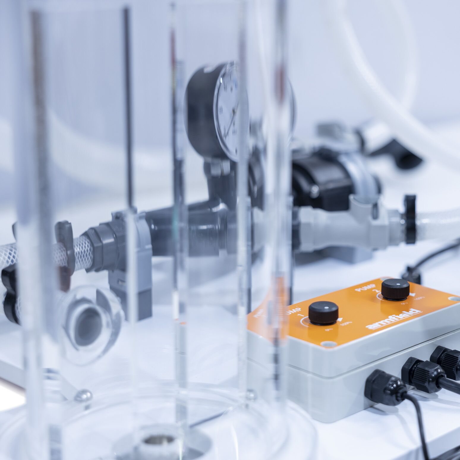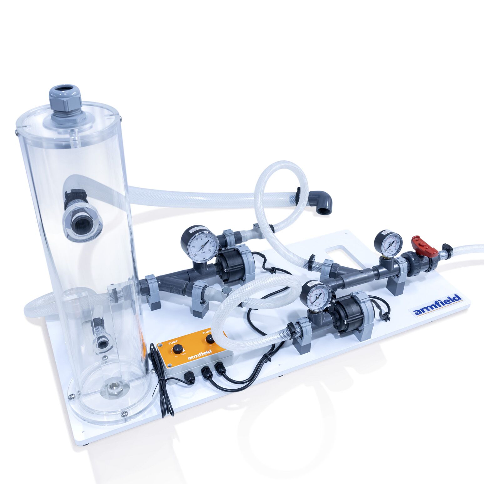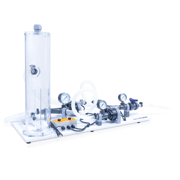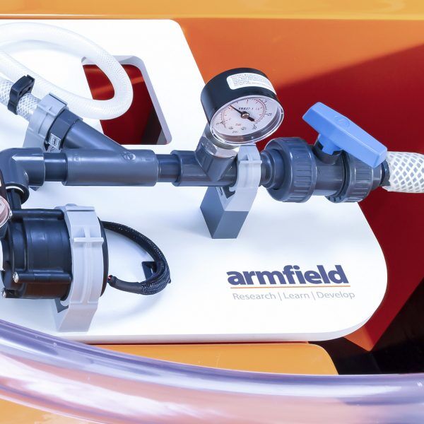 The pumps are fed from a constant head tank that forms part of the accessory, fed by the F1-10 pump. Flow discharges into the volumetric tank of the F1-10 via a flow control valve which permits an output pressure to be applied to load the pumps.