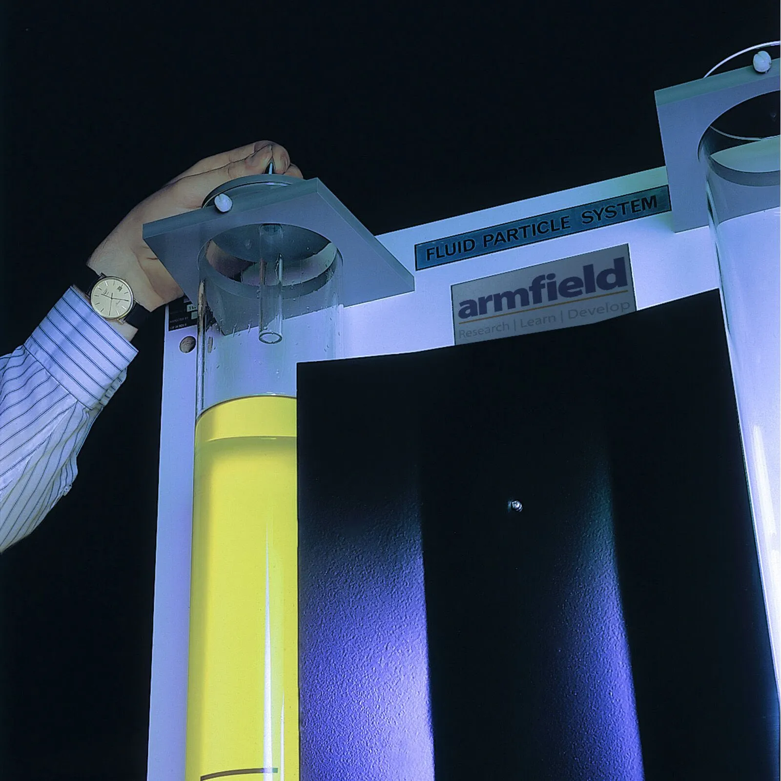 Observation of the particle movement is aided by a shielded fluorescent light mounted on the backboard between the glass tubes, marks on the tubes enable the rate of fall to be timed.