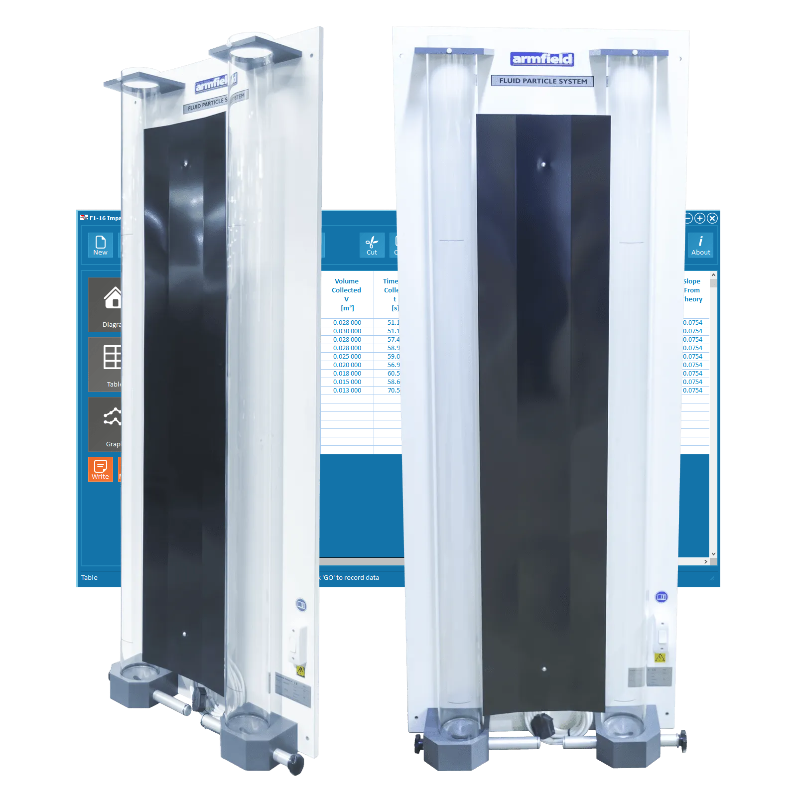 The equipment consists of two precision glass tubes 1.5m long and 93mm inside diameter fixed vertically on a wall-mounted backboard. A guide is provided at the top of each tube to facilitate the introduction of particles with the minimum of disturbance to the liquid. A sliding valve device at the bottom of each tube allows the particles to be removed with minimum loss of liquid.
