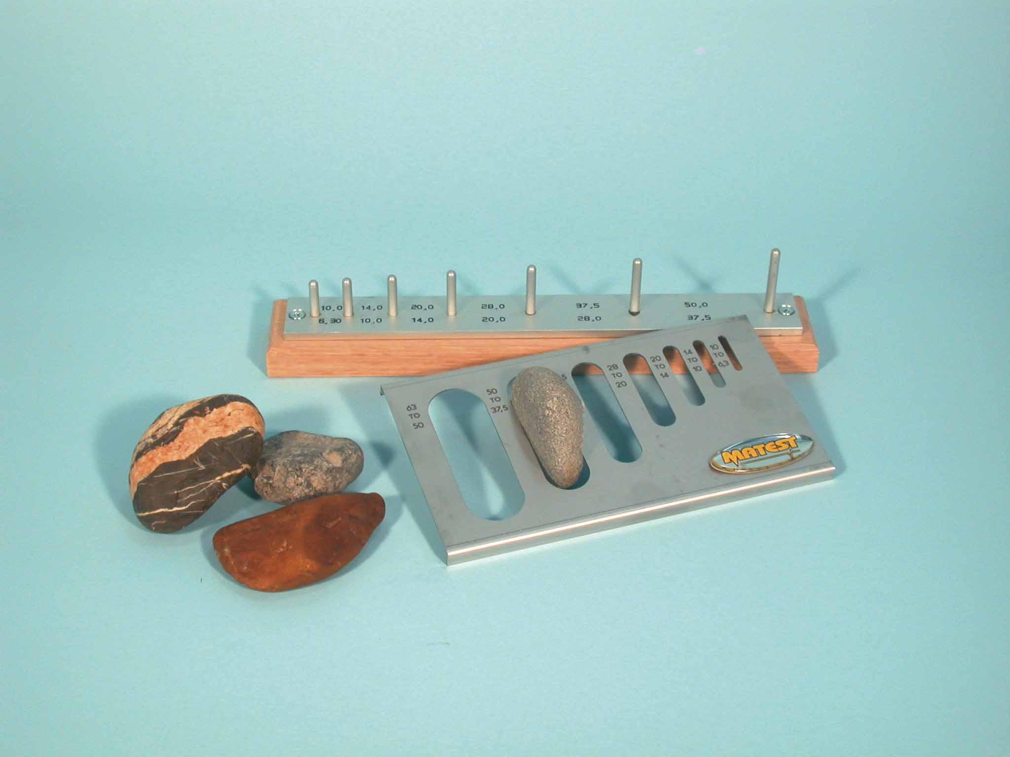 Suitable to verify if aggregate is flaky; i.e. if its thickness is less than 0.6 of its nominal size. Constructed of heavy gauge stainless steel sheet.
