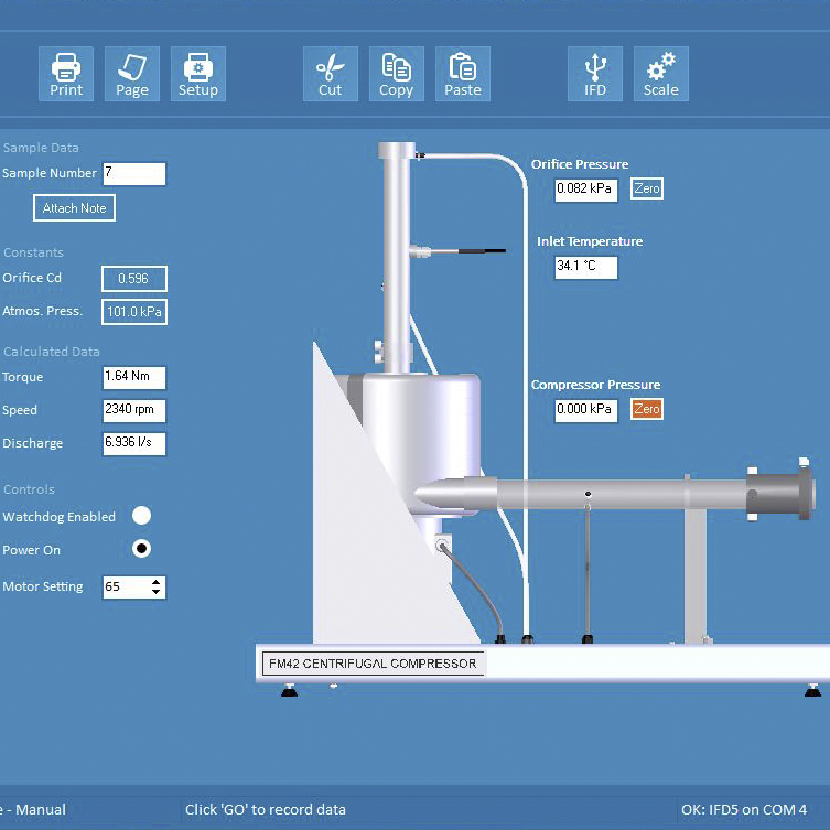 The compressor speed is accurately controlled by an advanced electronic inverter within the IFD7 (an essential accessory). This inverter also calculates the torque produced at the motor drive shaft allowing the power used by the fan to be derived. The IFD7 also provides the conditioning electronics for the sensors and allows their readings to be displayed on the computer software.