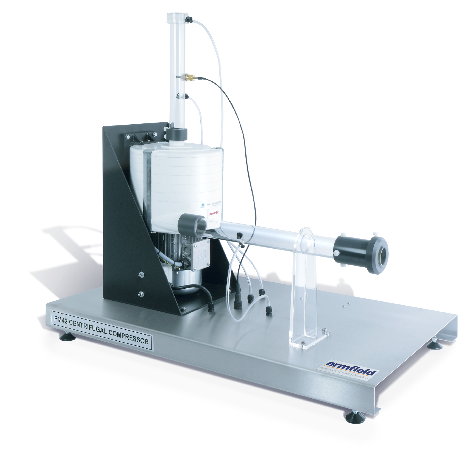 A motor driven multi-stage centrifugal compressor mounted on a stainless steel plinth with transparent air inlet and air outlet ducts. A manually operated adjustable aperture allows the air flow rate to be varied at constant fan speed. A calibrated orifice plate is used on the discharge to measure the air flow rate.