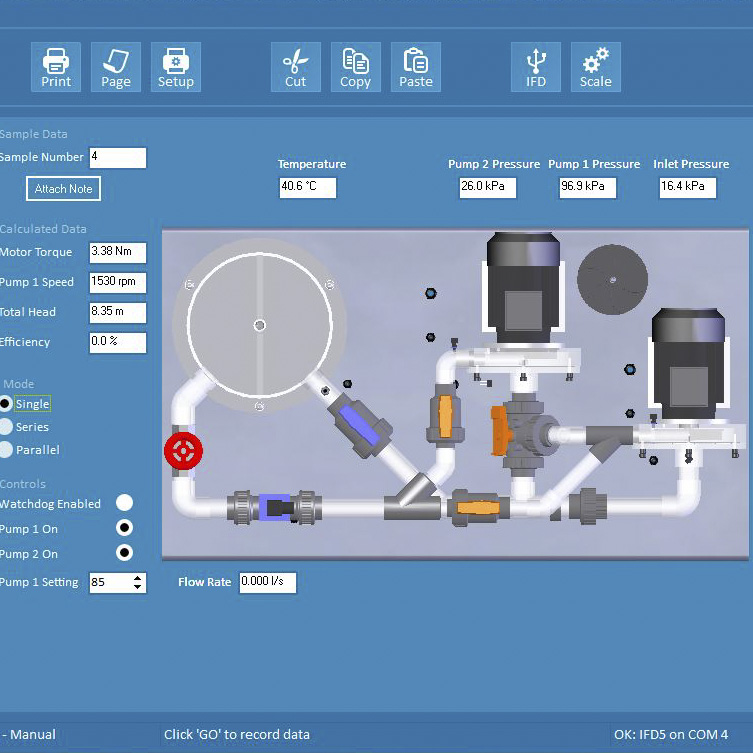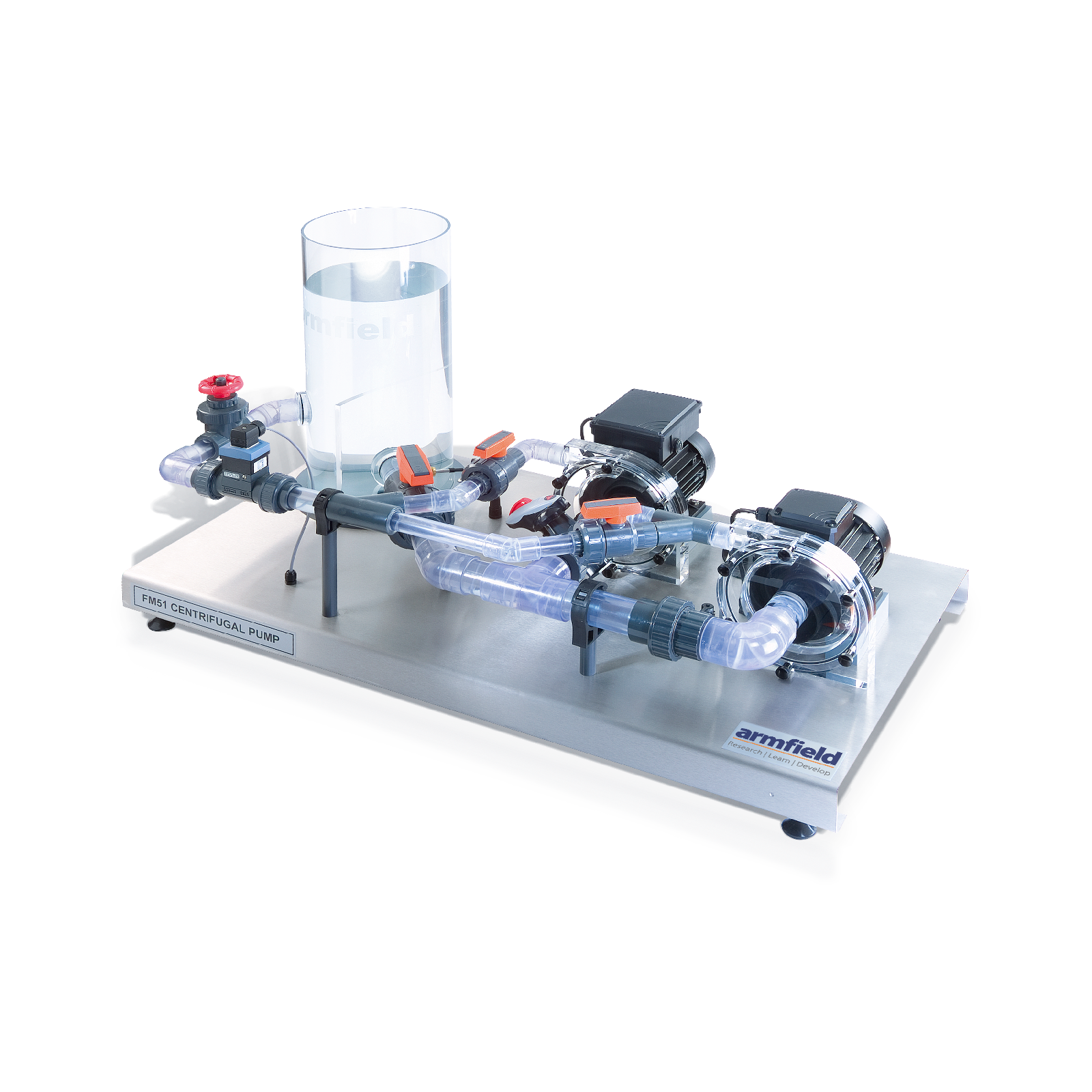Two motor-driven centrifugal pumps mounted on a stainless steel plinth with a water reservoir and pipework for continuous circulation. The pumps can be configured for single pump operation, two pumps in parallel or two pumps in series by using manually operated ball valves. Similarly, manual valves are used to control the flow and facilitate the study of suction effects, including demonstration of air release.