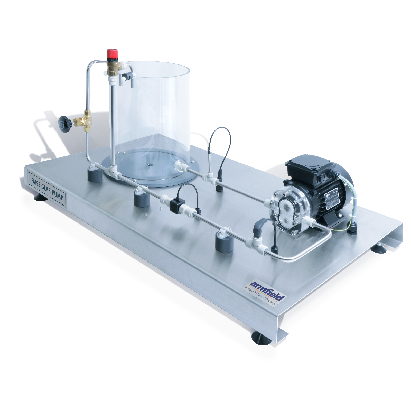 A motor-driven gear pump mounted on a stainless steel plinth with a water reservoir and pipework for continuous circulation. The pump head and the water reservoir are manufactured from clear acrylic for maximum visibility.
