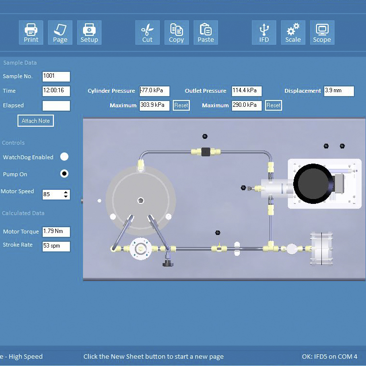 The FM53 replicates a plunger pump as used in industry to pump small quantities of liquid at high pressures. Electronic sensors measure the instantaneous cylinder pressure within the pump, the pump displacement and the cumulative flow.