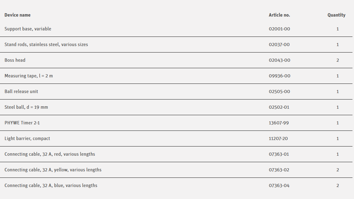 Pupils should examine a body’s free fall under the earth’s gravitational pull with the timer, a starting apparatus and a photoelectric gate, and they should determine the earth’s gravitational acceleration from the information obtained.