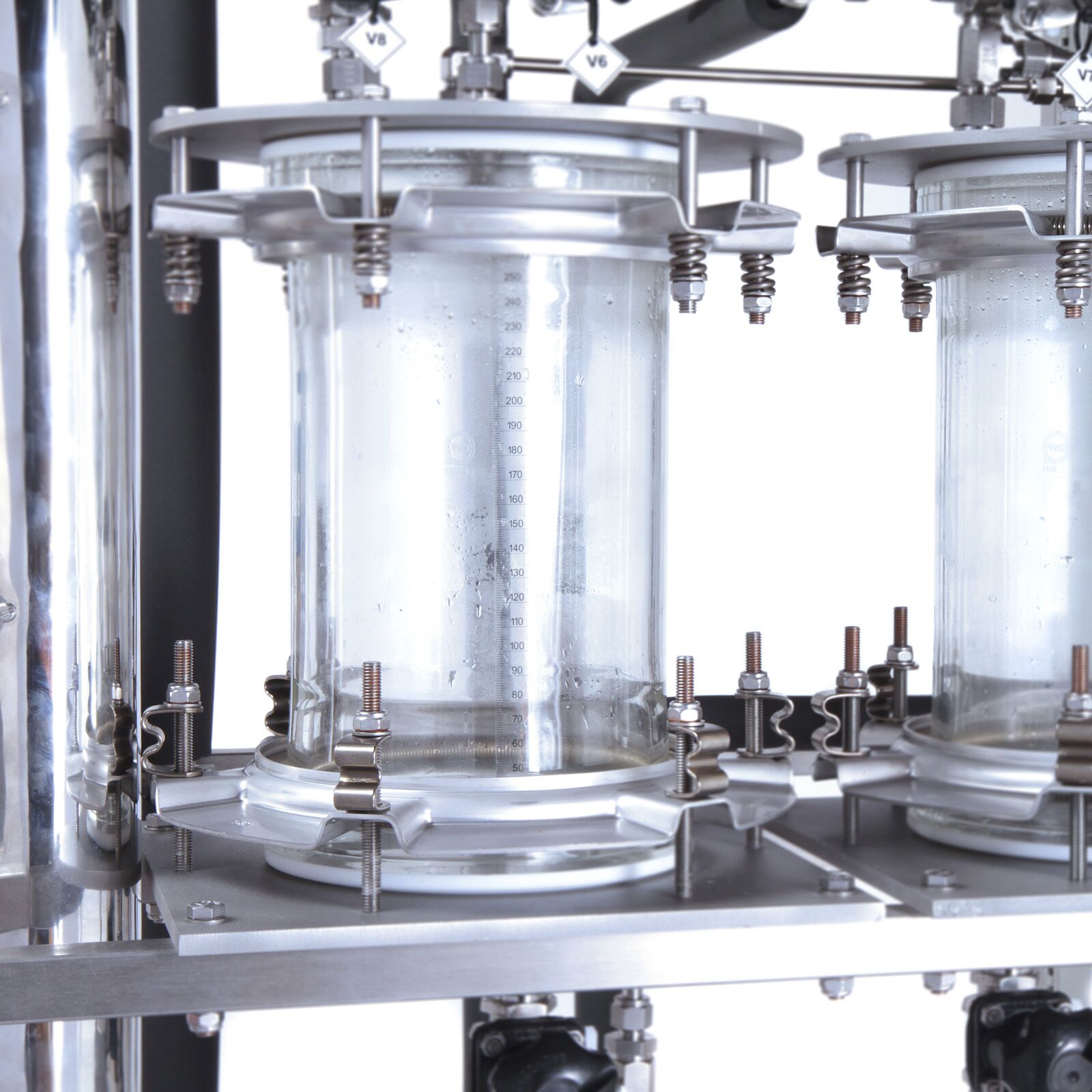The single tube-in-jacket evaporator replicates industrial units which often contain scores of much longer tubes within the steam space. The component parts of the industrial process have been scaled down, feed tank, vapour/liquid separator, condenser, concentrate tank, condensate tank, CIP pump and vacuum pump, all manufactured from hygienic materials such as stainless steel, PTFE and glass.
