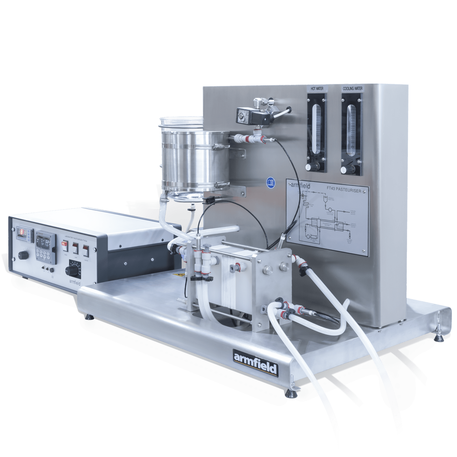 This self-contained laboratory unit is suitable for HTST (high temperature, short time) pasteurisation of up to 20 litres/hour of a wide variety of low-viscosity liquid foods. Products that may be pasteurised include raw milk, nectars, fruit juices, skimmed milk, ice-cream mix, soft drinks, pharmaceuticals and margarine emulsion.