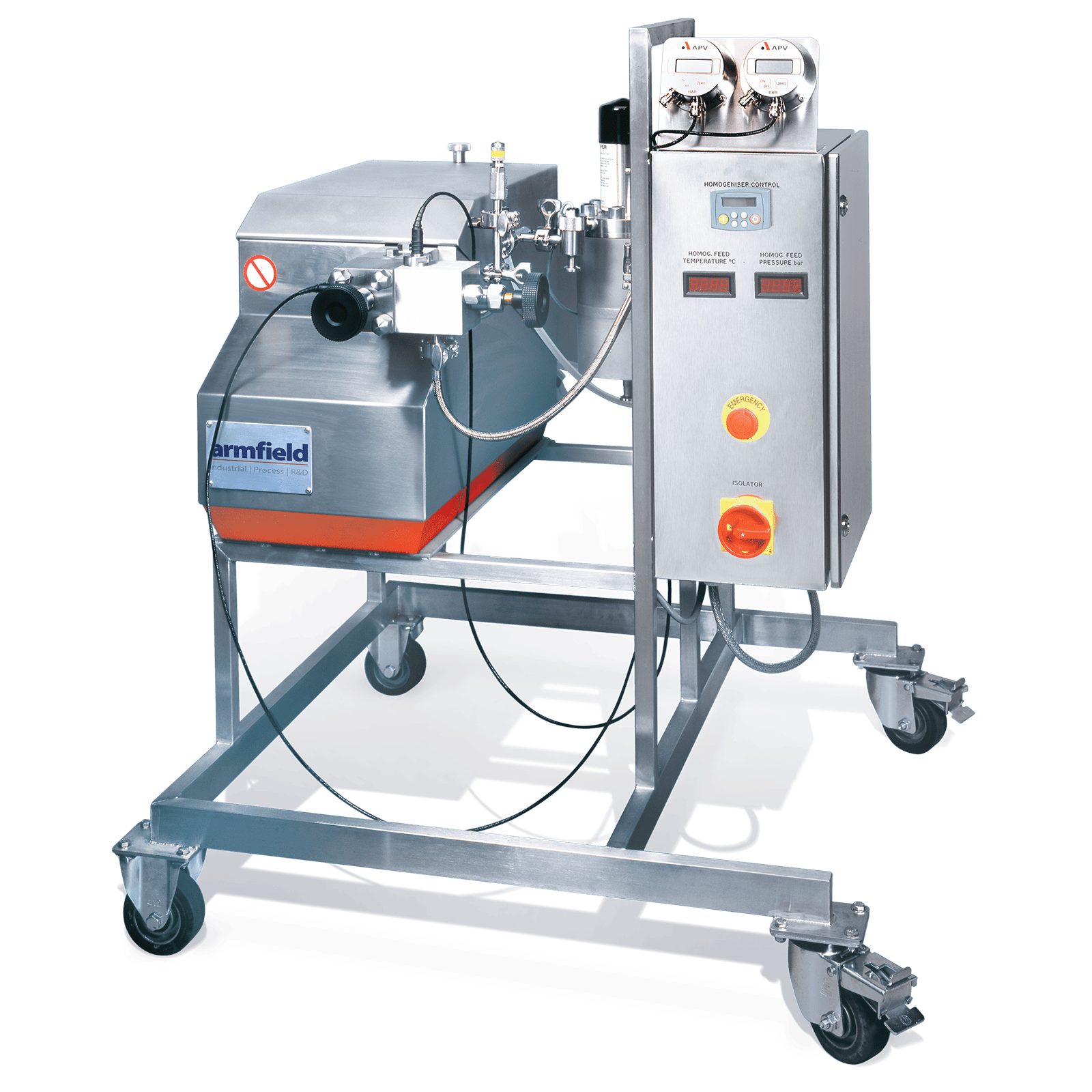 Hand wheel adjustment is provided for both stages of homogenisation pressure. The homogenisation pump speed is electronically controlled from the console, and a manually adjustable divert valve is used to compensate for any inequalities between the flow rate from the FT74XA and the homogeniser, or any fluctuations in these flows.