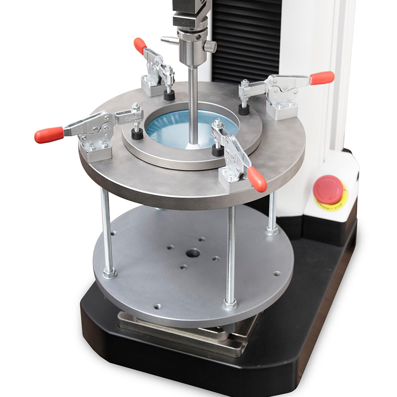 The G1110 is designed for determining the puncture resistance of plastic films and other materials up to 1,000 lbF (5 kN), in conformance with ASTM D5748. The fixture’s generous height accommodates materials with long elongation. Four toggle clamps and a compression ring with concentric ridges effectively secure the material, while the included plunger with ball probe stretches and ruptures the sample.