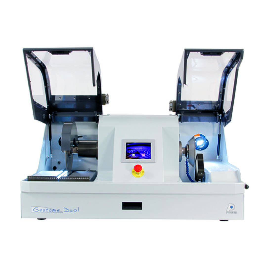 Geotome dual has two working zones. One allowing cutting of rock samples, the other pre-polishing of thin sections.