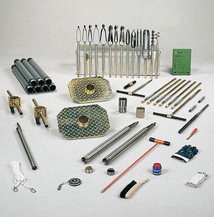 The set contents include: various types of soil augers to reach the groundwater level, augers for the extraction of less-disturbed soil samples, extension rods, synthetic casing tubes with steel screw thread sockets, tube clamps with adjustable quick fastener for driving in and withdrawing the casing tubes, bailers with steel and synthetic valves, casing tube platforms for more ergonomic working, spare parts and various accessories. The set is delivered in two aluminium transport cases.