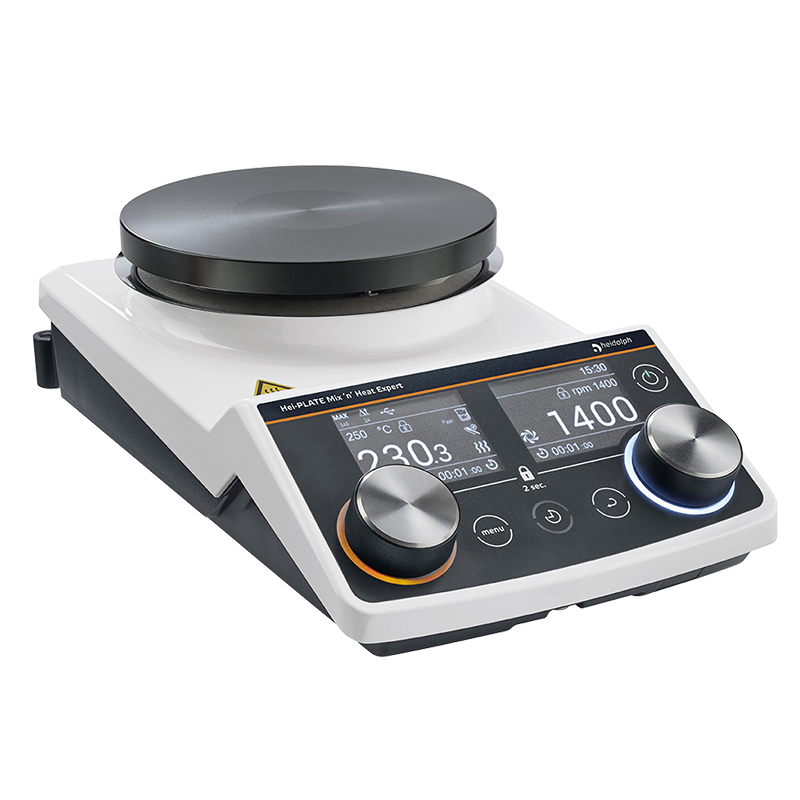 The Hei-PLATE Mix ‘n’ Heat Expert magnetic stirrer offers intuitive operation and user-friendly features. With dedicated displays for stirring and heating, you can easily monitor all values and settings at a glance. The device is operated via two push-and-rotate controls with LED rings, making it simple to identify active functions. Separate timers for heating and stirring add flexibility, allowing you to better control your experiments. The straightforward menu navigation enhances ease of use.