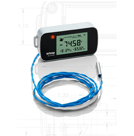 The InTemp CX405-RTD Dry Ice data logger is specifically designed for ultra-low temperature monitoring of vaccines and pharmaceuticals in storage and transportation environments. Using Bluetooth technology, it wirelessly communicates with the InTemp CX Gateway and/or the free InTemp mobile app, which send data to the free InTempConnect cloud platform. Its built-in 1.5 m external probe can measure temperatures as low as -95°C (-139°F) and up to 50°C (122°F) with a high degree of accuracy, and a protective sheath prevents accidental cutting of the probe cable. Includes a clip for secure mounting.