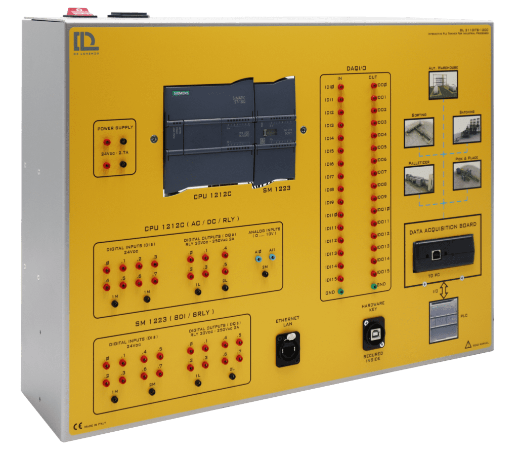 The DL 2110ITS is a training tool for PLC programming, that uses a PLC SIEMENS (SIMATIC S7‐1200 series) and an interactive educational software for the simulation of industrial environments to be controlled.
