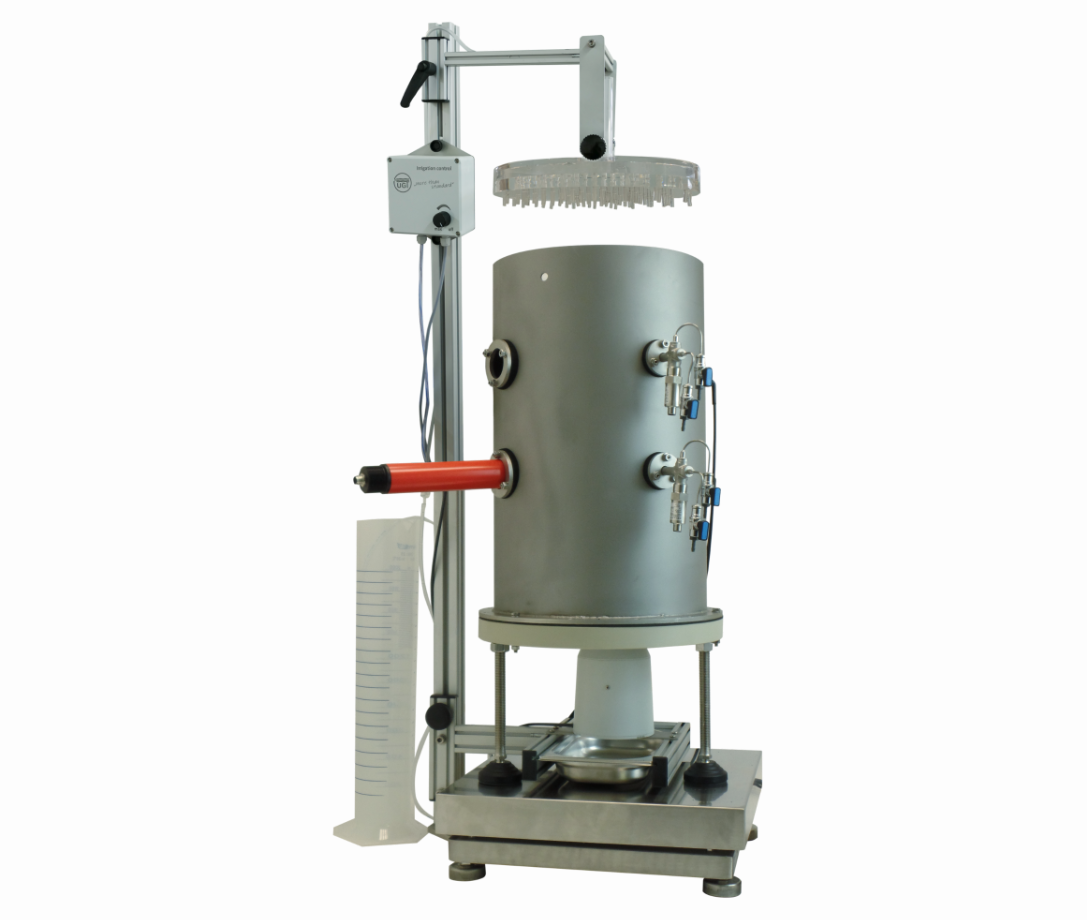 The UGT laboratory lysimeter can be extended by a tension- and time-controlled suction probe system for automated control of the pore water extraction module and the lower lysimeter rim module, and by a sprinkler system.